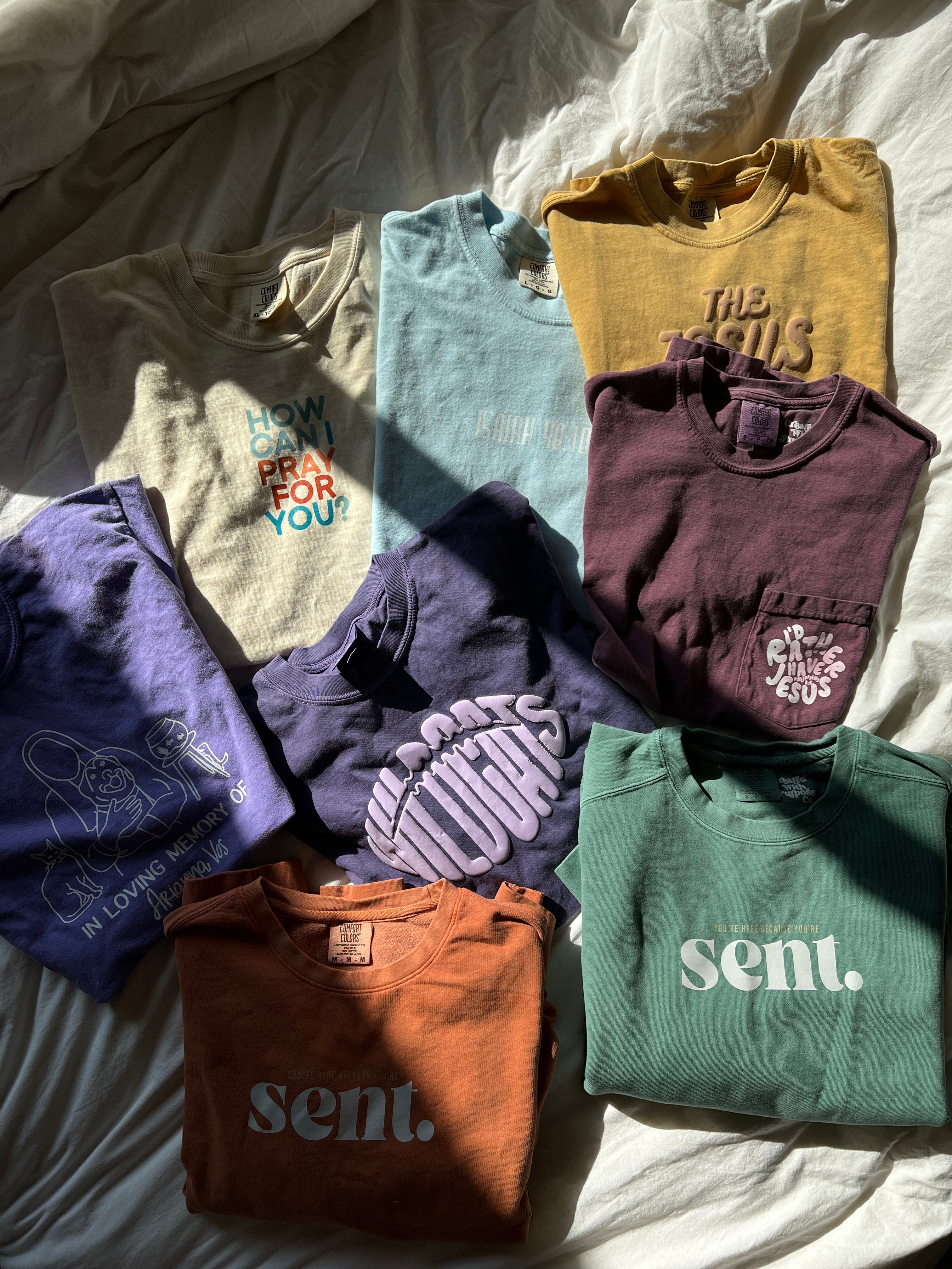 Faith-based tees and crews with tiny flaws and big purpose. Because grace covers it all.