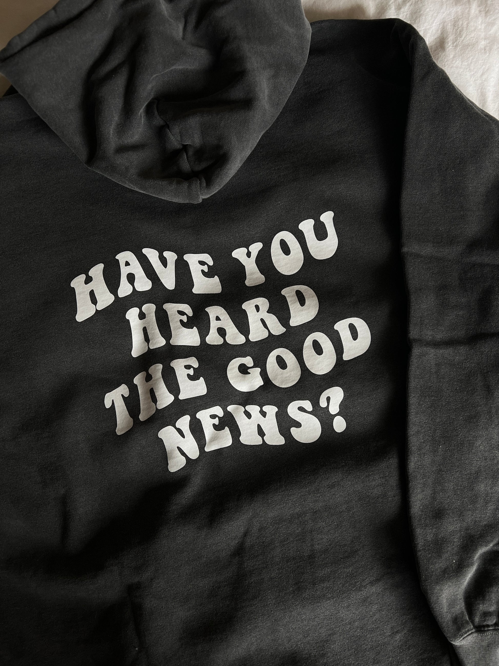 This design was inspired by the mission behind our company. We want to share the good news of Jesus Christ and spark Jesus-centered conversations with everyone! What better way to do that than with this hoodie that catches everyones eyes?! The idea of this hoodie came from Isaiah 52:7, “How beautiful on the mountains are the feet of the messenger who brings good news, the good news of peace and salvation, the news that the God of Israel reigns!”