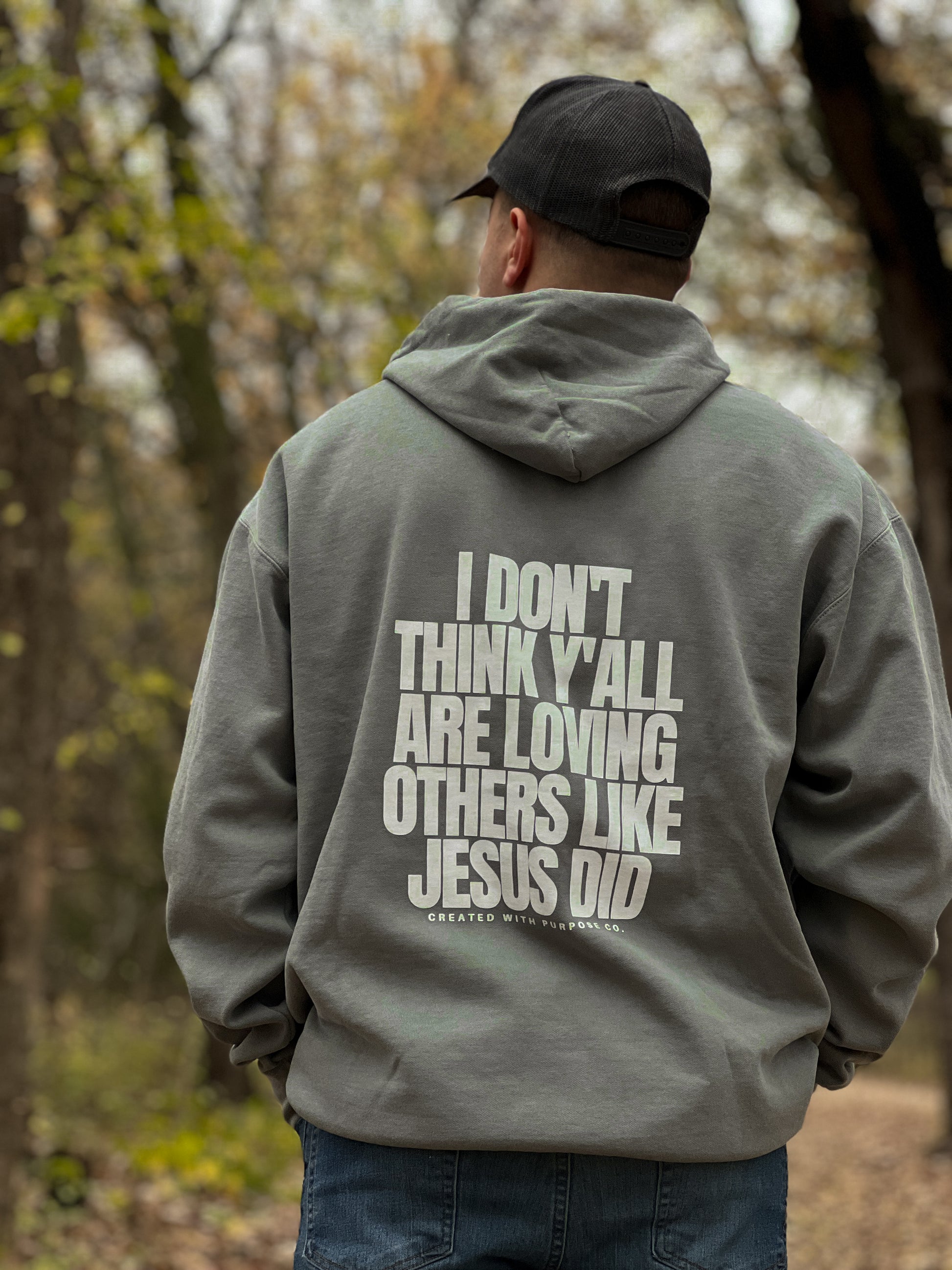 Introducing our impactful hoodie, inspired by John 13:34, where Jesus instructs His disciples, saying, "A new command I give you: Love one another. As I have loved you, so you must love one another." This hoodie boldly captures the importance of this commandment and confronts the lack of love in our world today. With the phrase "I don't think ya'll are loving others like Jesus did" and "Jesus Type of love" on the front, it serves as a reminder and a call to action.
