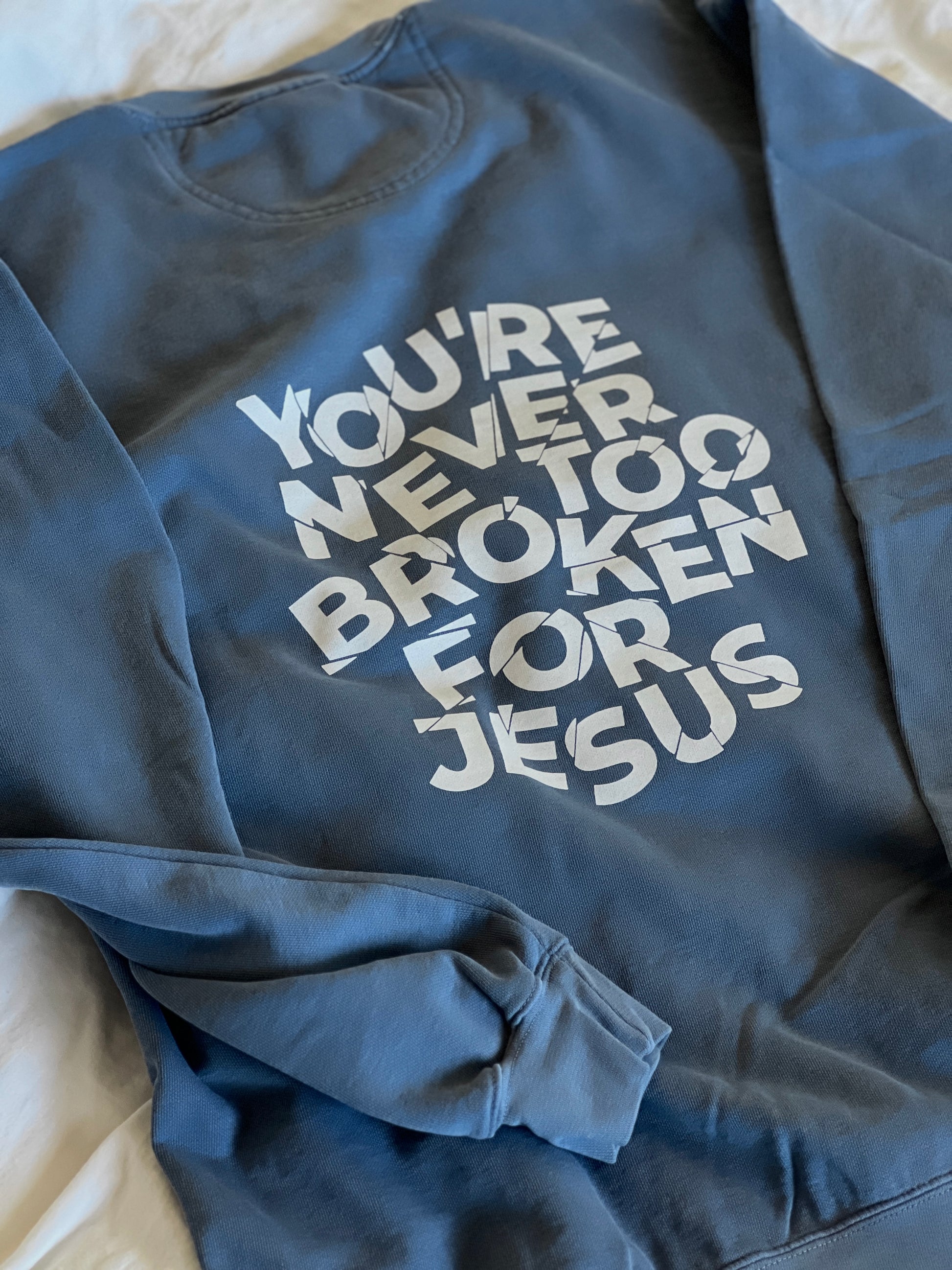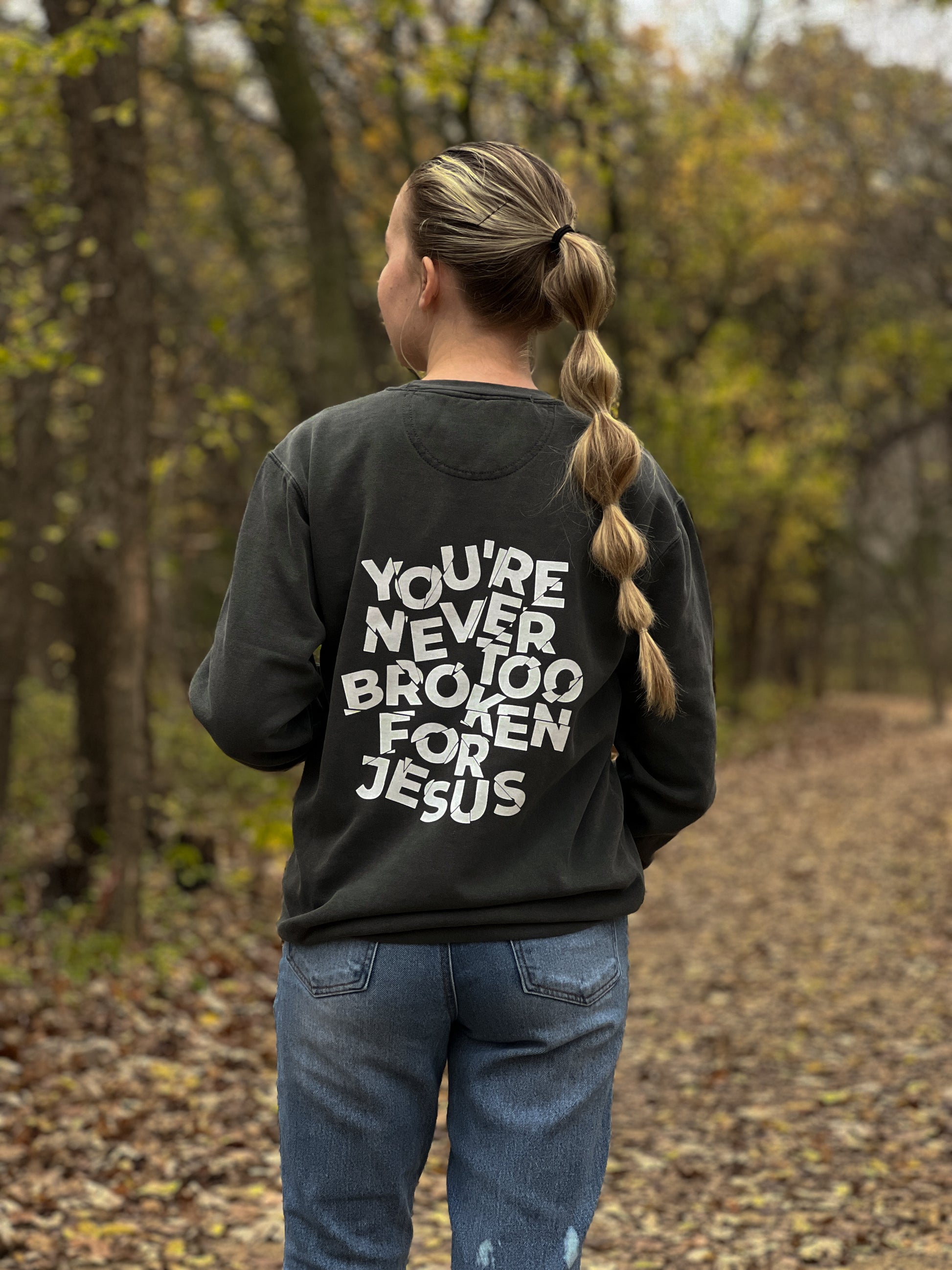Embrace this crewneck as a symbol of hope and restoration. As you wear it, remember that no matter how broken or burdened you may feel, God's grace is sufficient, and His forgiveness is everlasting. Allow others to witness the transformative power of God's love in your life and inspire them to seek His embrace. Let this crewneck be a beacon of light, inviting others to experience the freedom found in surrendering their brokenness to the loving hands of our Heavenly Father.
