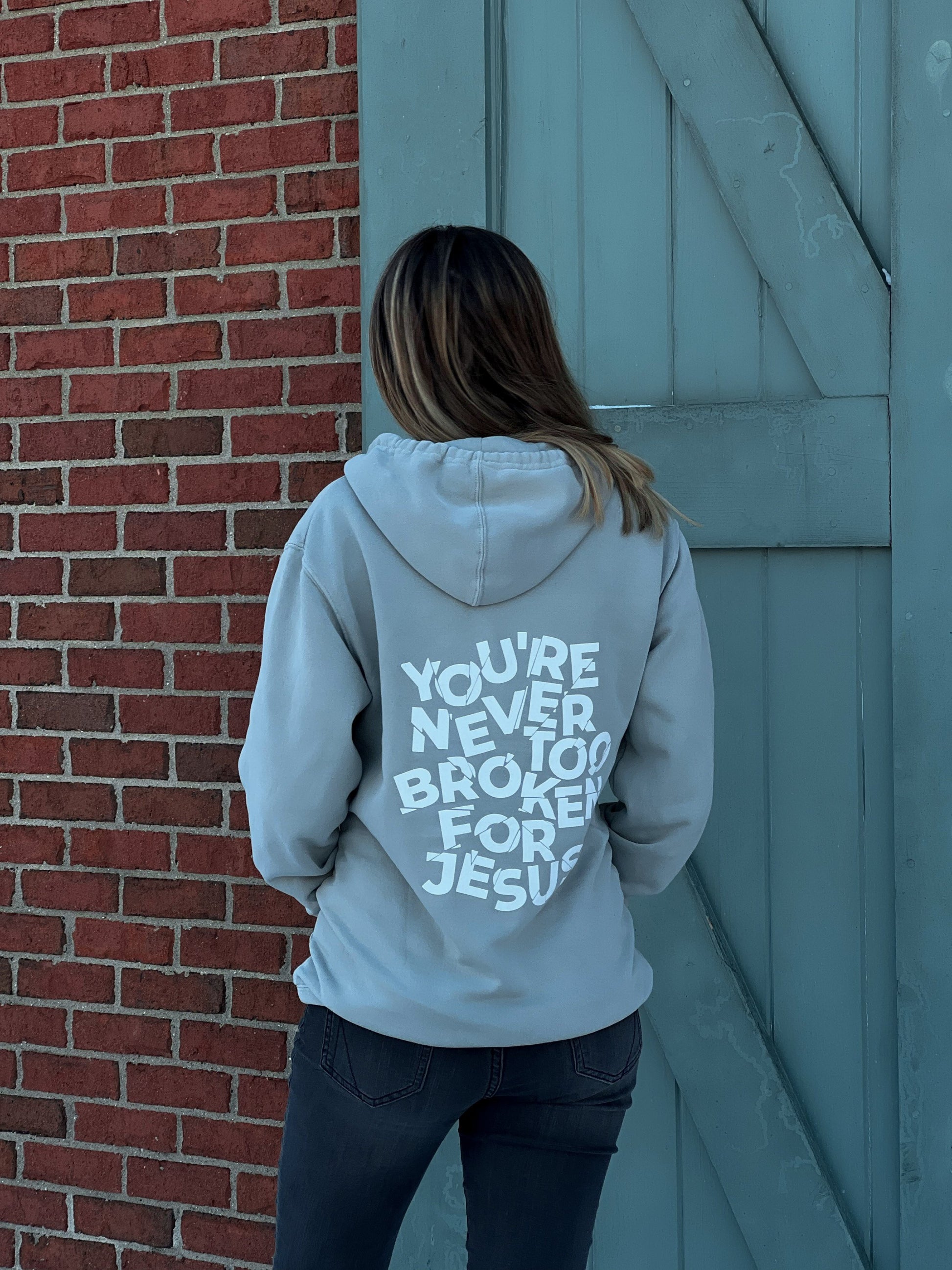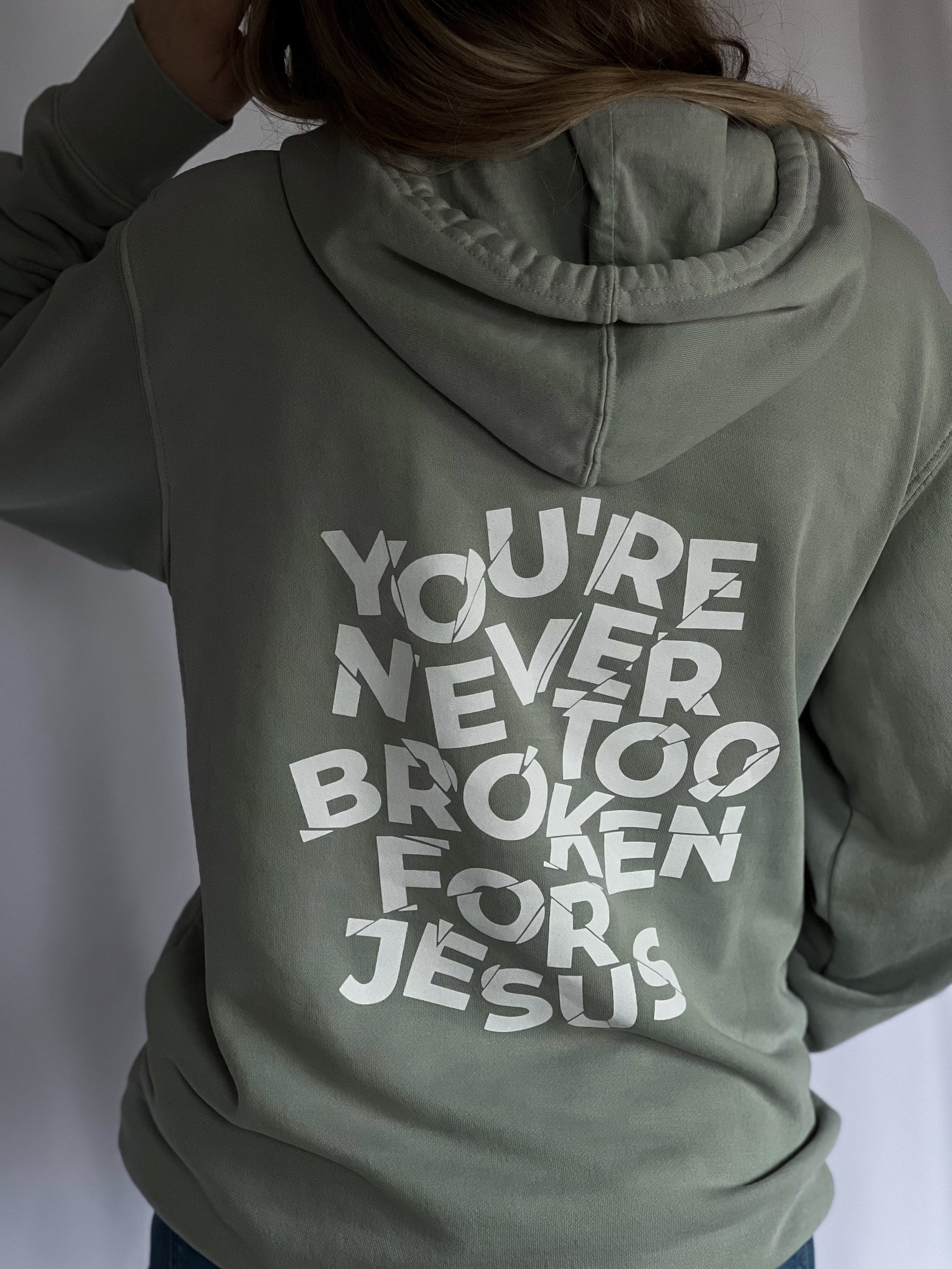 Embrace this hoodie as a symbol of hope and restoration. As you wear it, remember that no matter how broken or burdened you may feel, God's grace is sufficient, and His forgiveness is everlasting. Allow others to witness the transformative power of God's love in your life and inspire them to seek His embrace. Let this hoodie be a beacon of light, inviting others to experience the freedom found in surrendering their brokenness to the loving hands of our Heavenly Father.