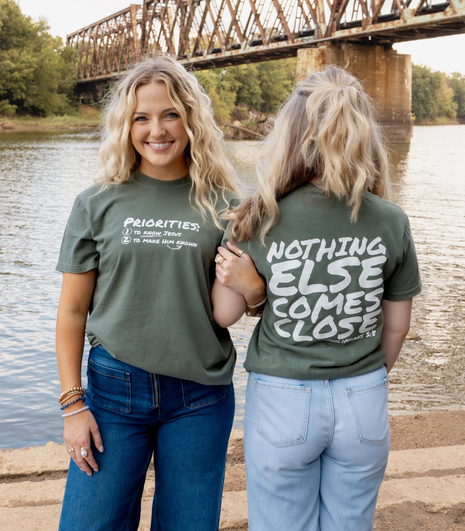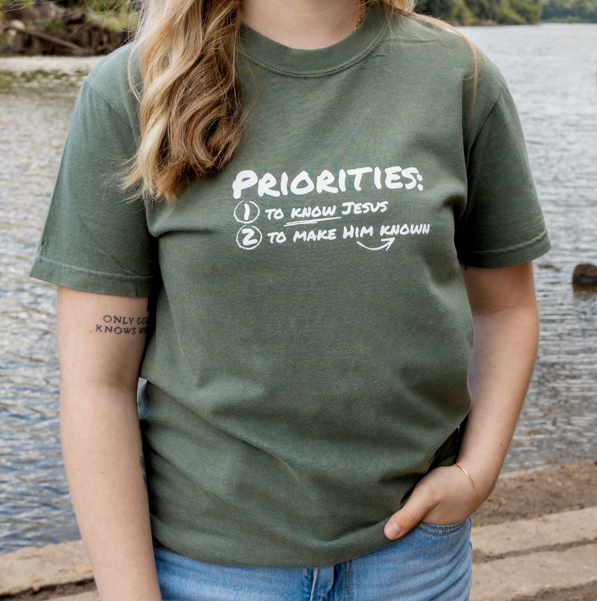 The “Priorities Tee” is inspired by Philippians 3:8, where Paul writes, “Indeed, I count everything as loss because of the surpassing worth of knowing Christ Jesus my Lord.” This verse reminds us that nothing in this life compares to the treasure of knowing Christ. Success, possessions, and achievements all fade in light of Him. What truly matters is setting our hearts on what is eternal.
