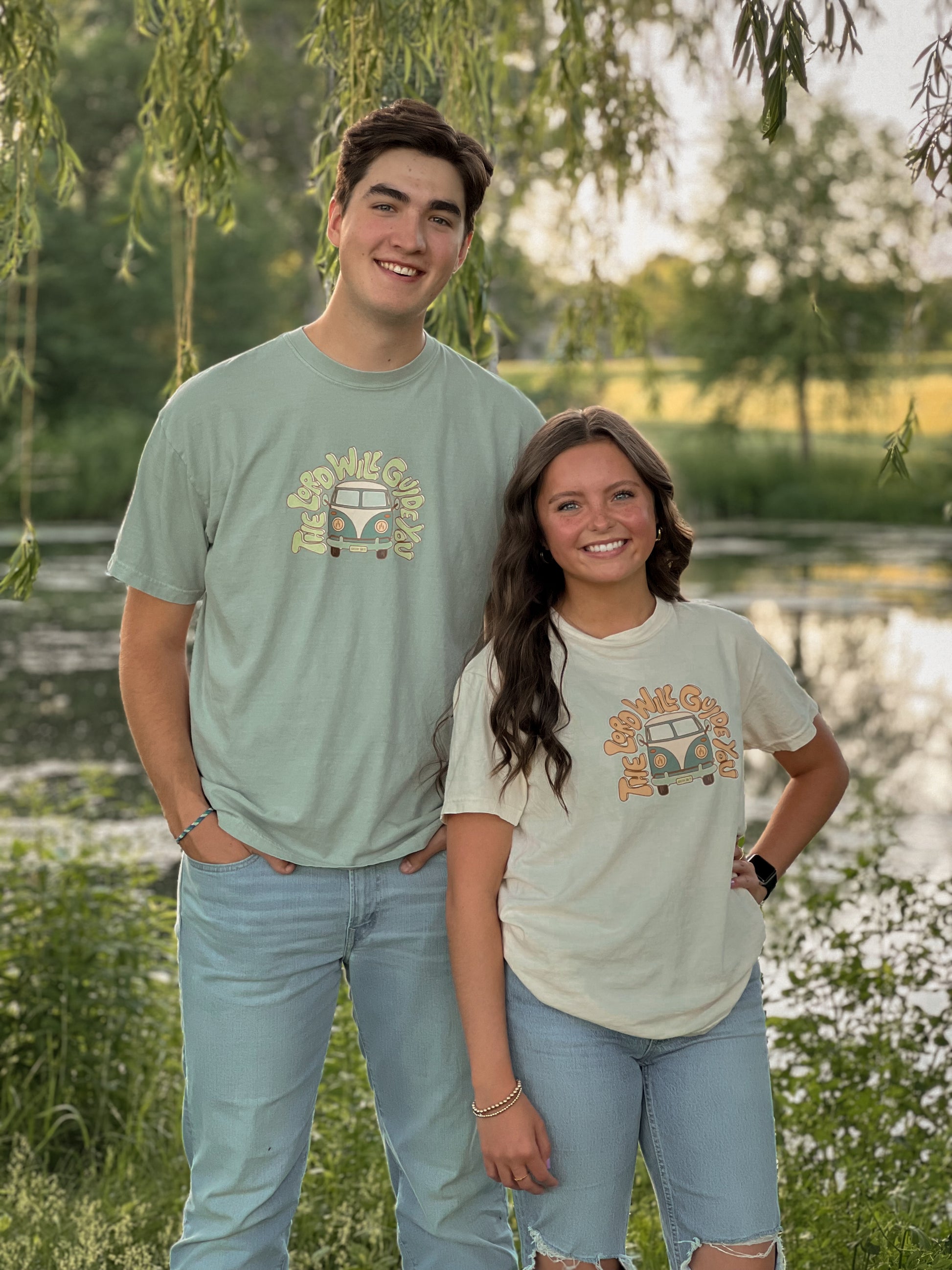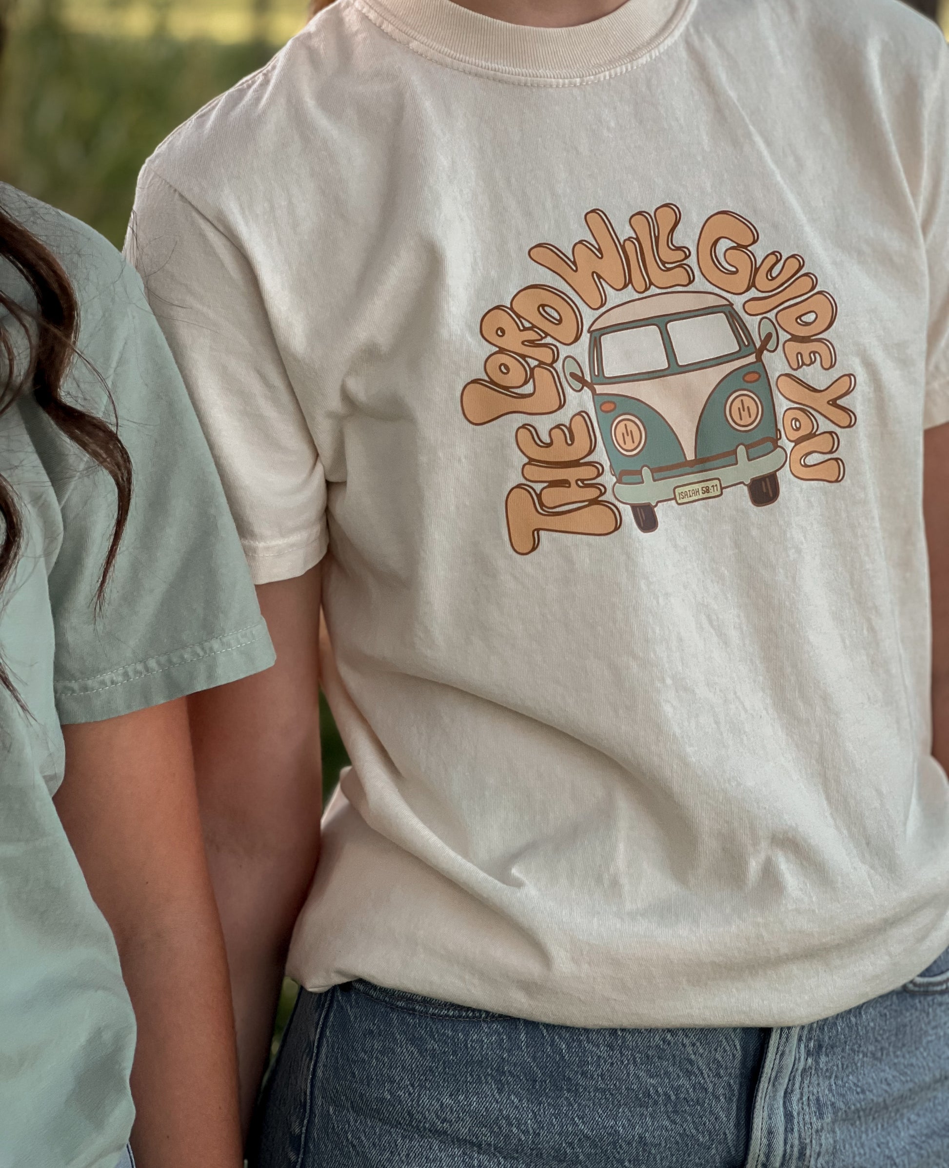 This tee carries the profound message of Isaiah 58:11, embodying the unwavering guidance of our Lord. The design features a classic Volkswagen-style van in soft pastel colors, with "The Lord will guide you" elegantly encircling it in a retro font. Scripture reassures us, "The Lord will guide you always; he will satisfy your needs in a sun-scorched land and will strengthen your frame." These words are a testament to God's constant presence and direction in our lives.